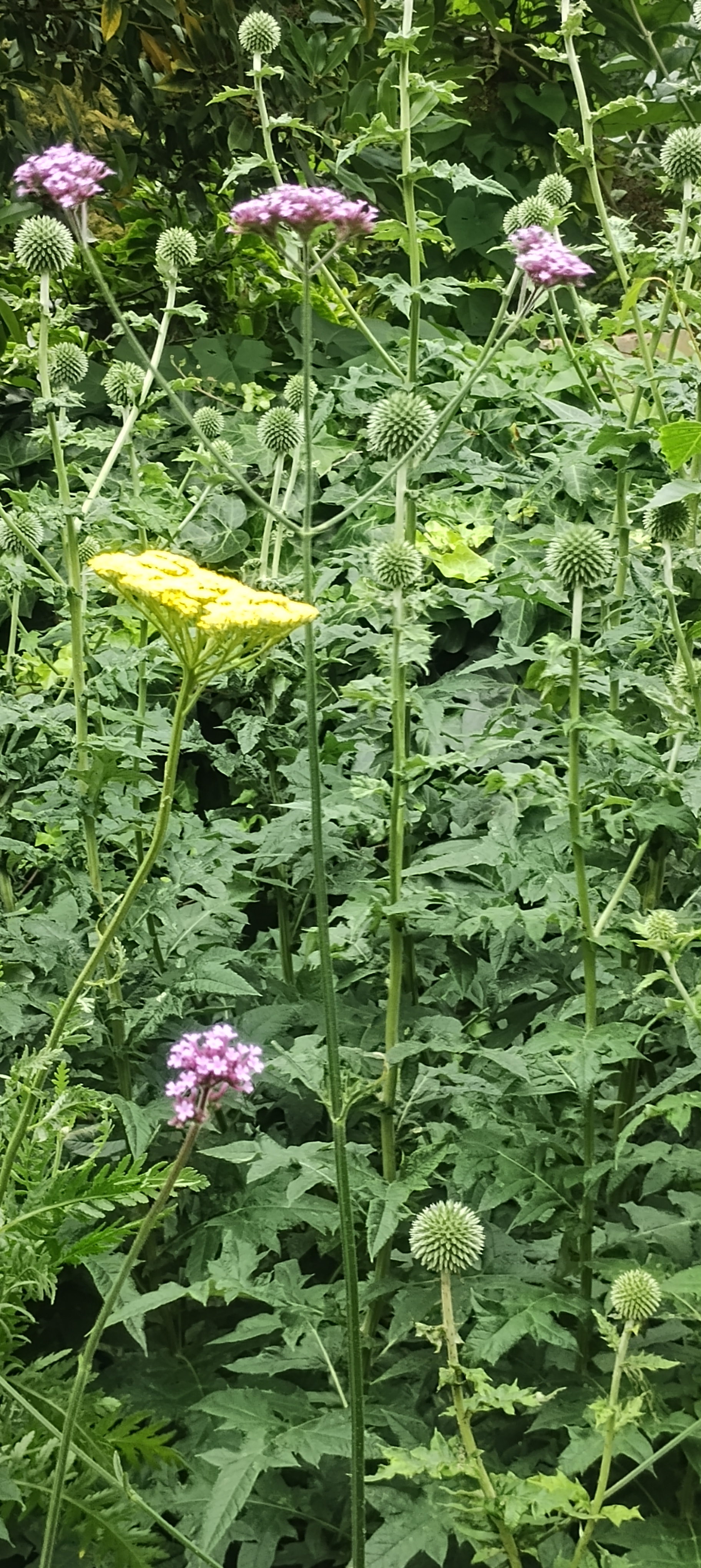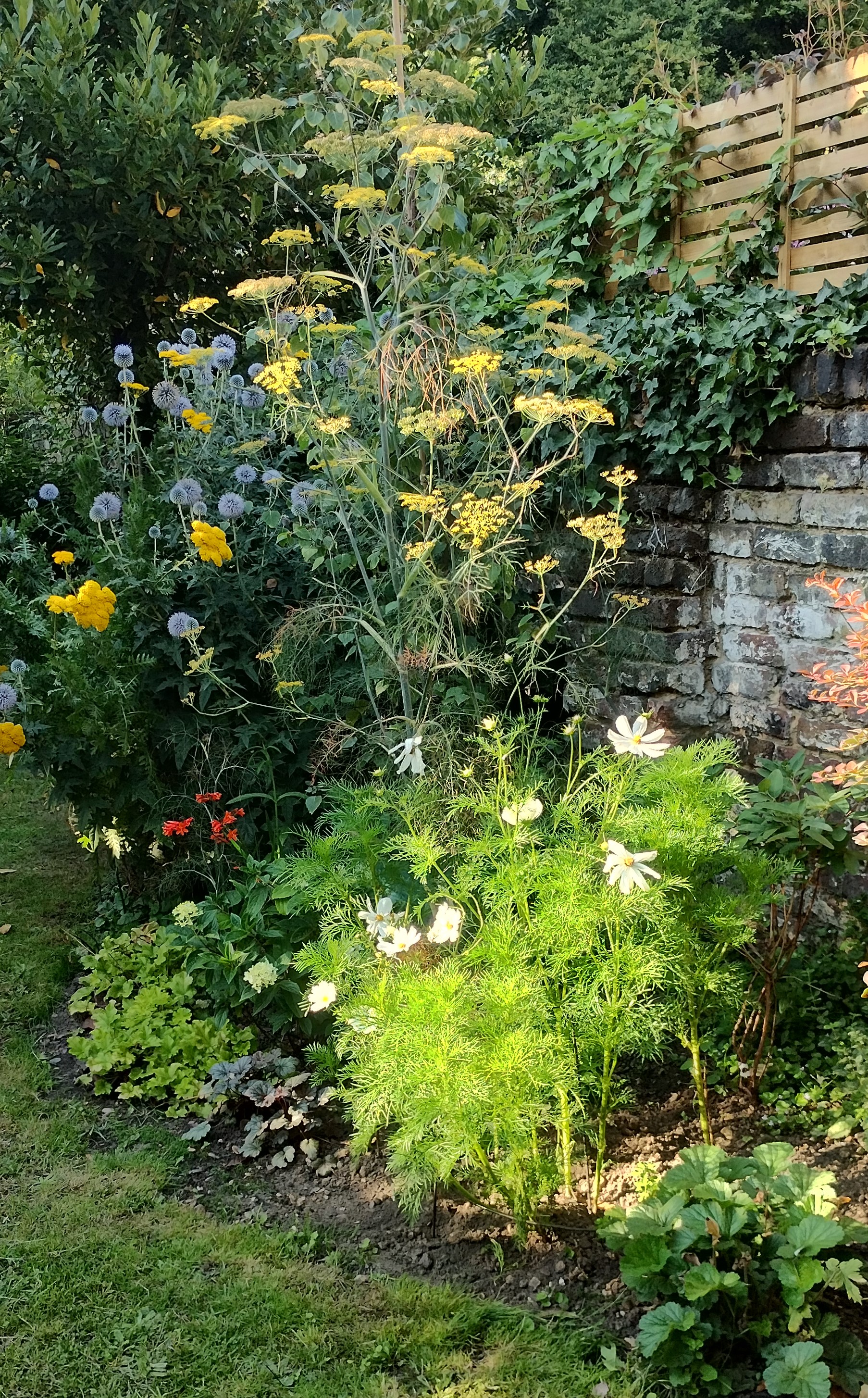 Comparing this July to last year it’s amazing how much that did well last year was just massacred by slugs in the spring. This year there have been no shasta daisies, cosmos, bell flowers or hyssop and last year’s big picture shows much more yellow from the achillea than this. Last year’s fennel was over 6 foot tall and flowering majestically, this year’s is more like 4 foot and although flowers are visible it’s nothing like it was – the slugs got at it early on in and it has never really recovered.