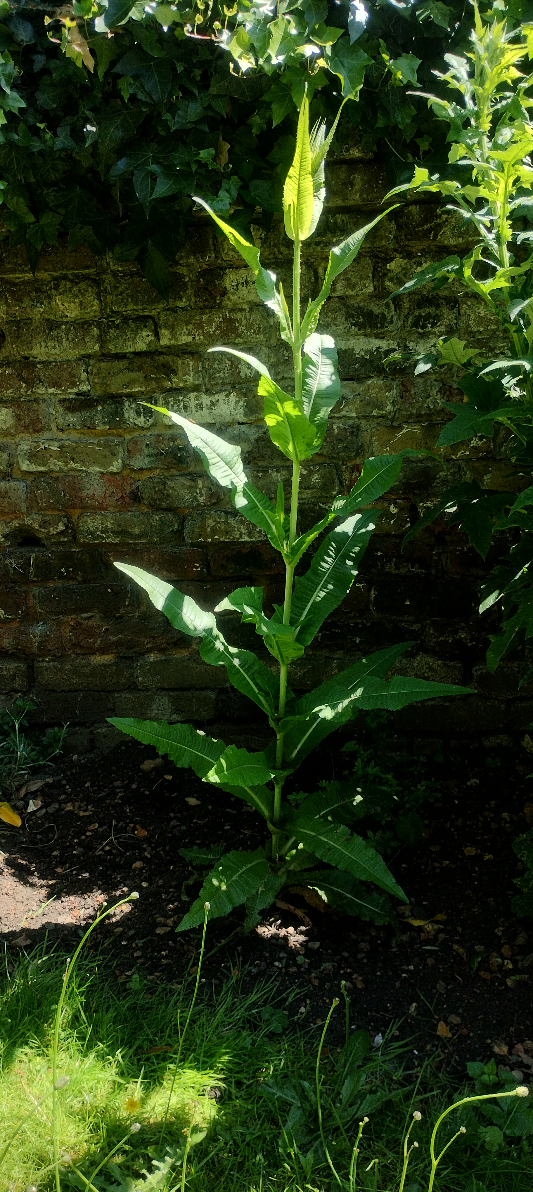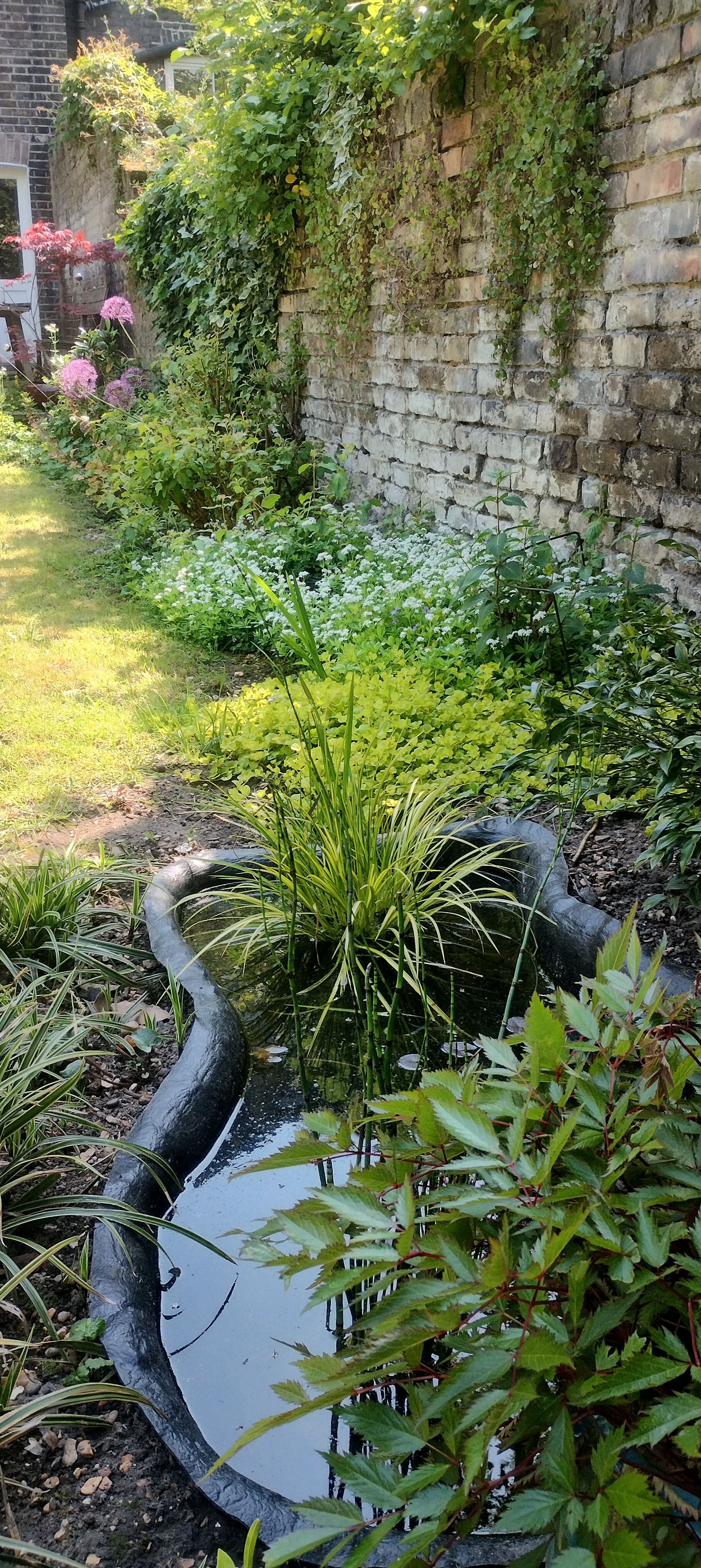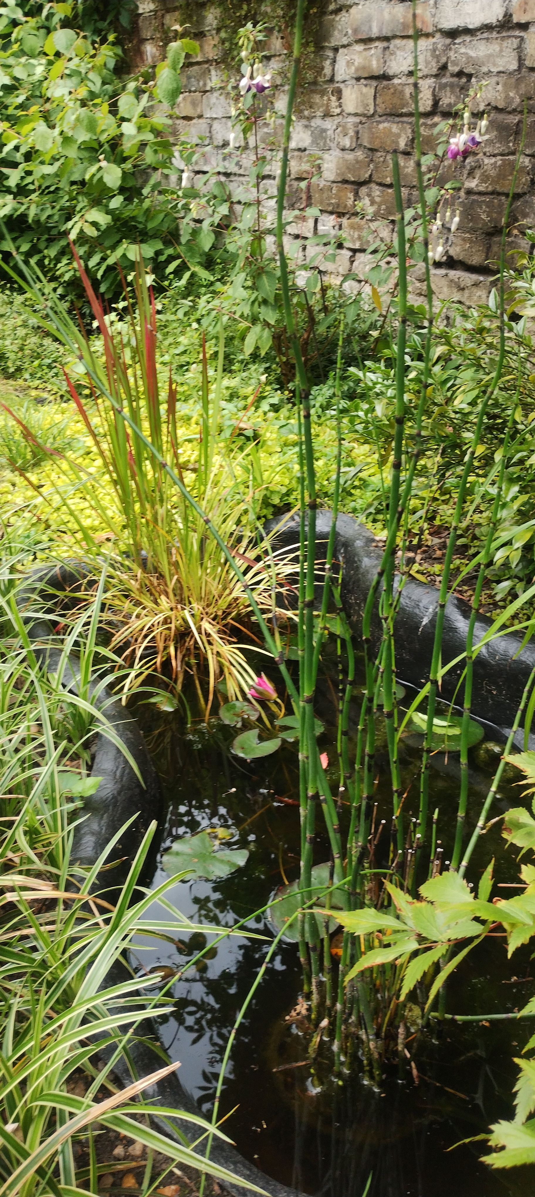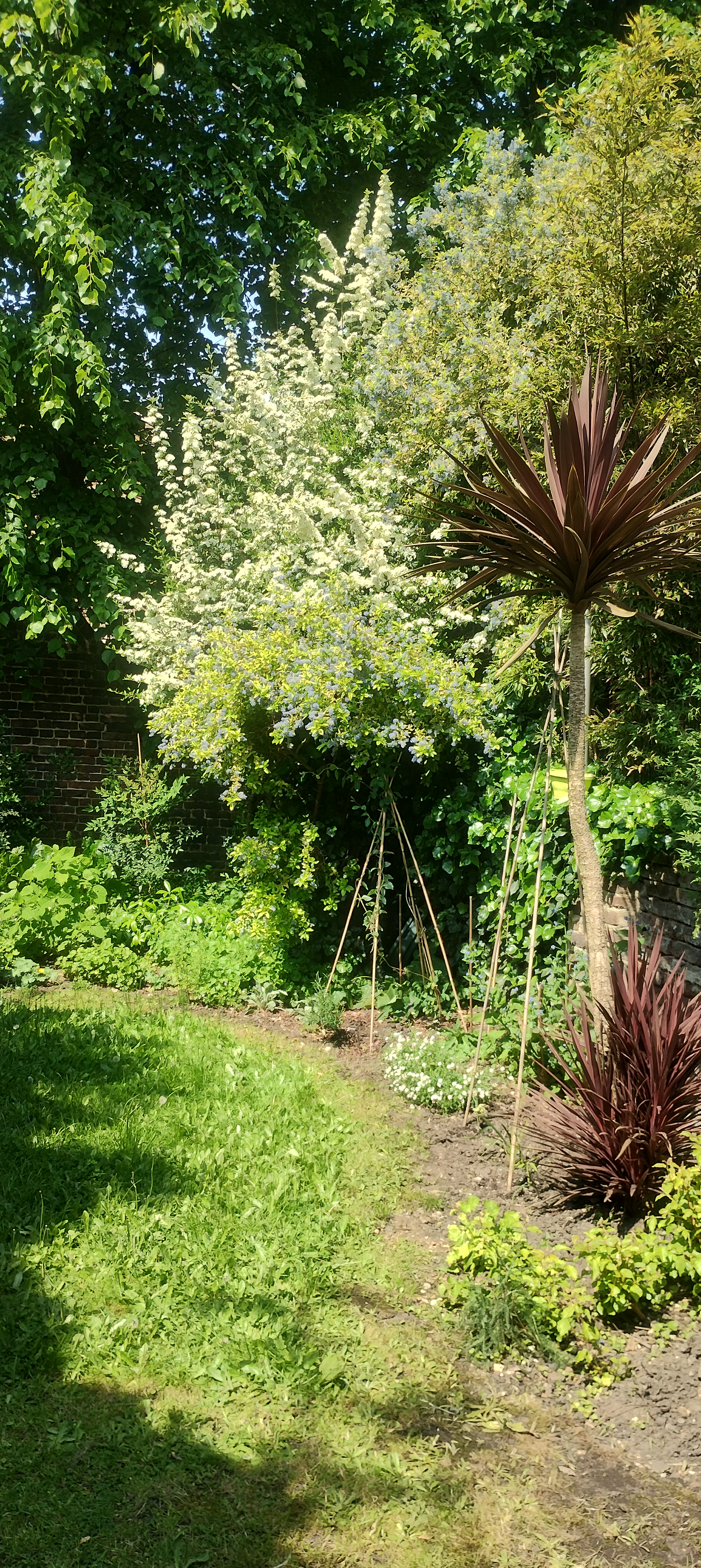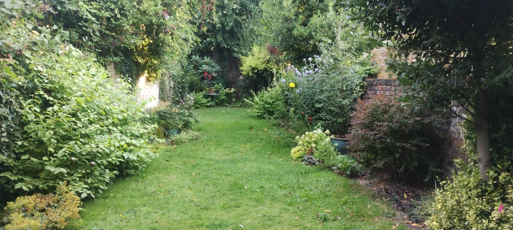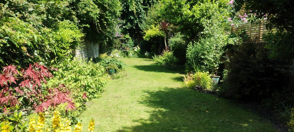 The teasel is now at my head height and producing spiky flower heads. The valerian planted at the end of June in the side beds seems to be slug-resistant and is establishing itself. The campion rescued from the lawn last year is flowering under the ceanothus and will hopefully spread this year. The Japanese anemones are putting up lots of buds. There have been flowers on the water lily, the sedge and the grasses have both grown, though I feel there’s more I could do with it (one bonus – it is a spectacular slug-trap)