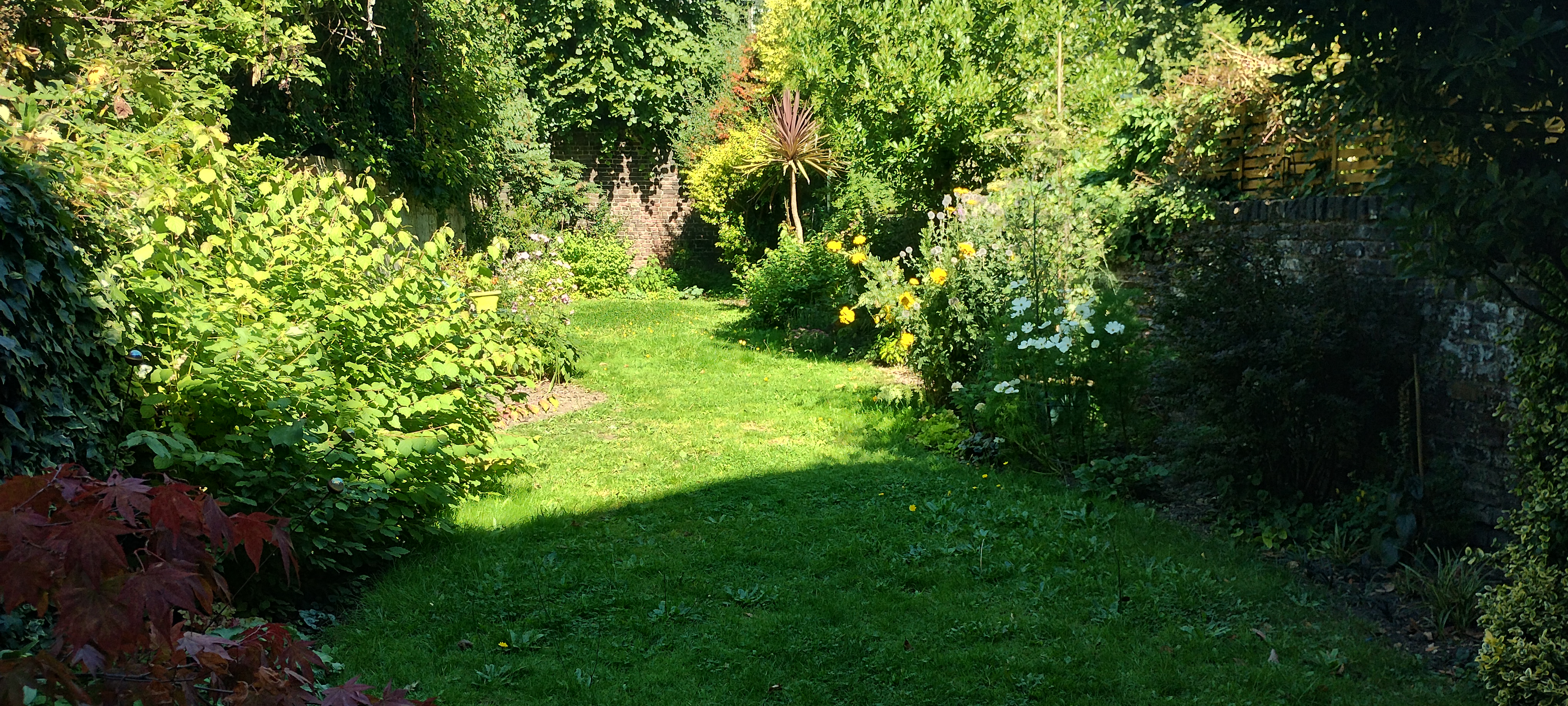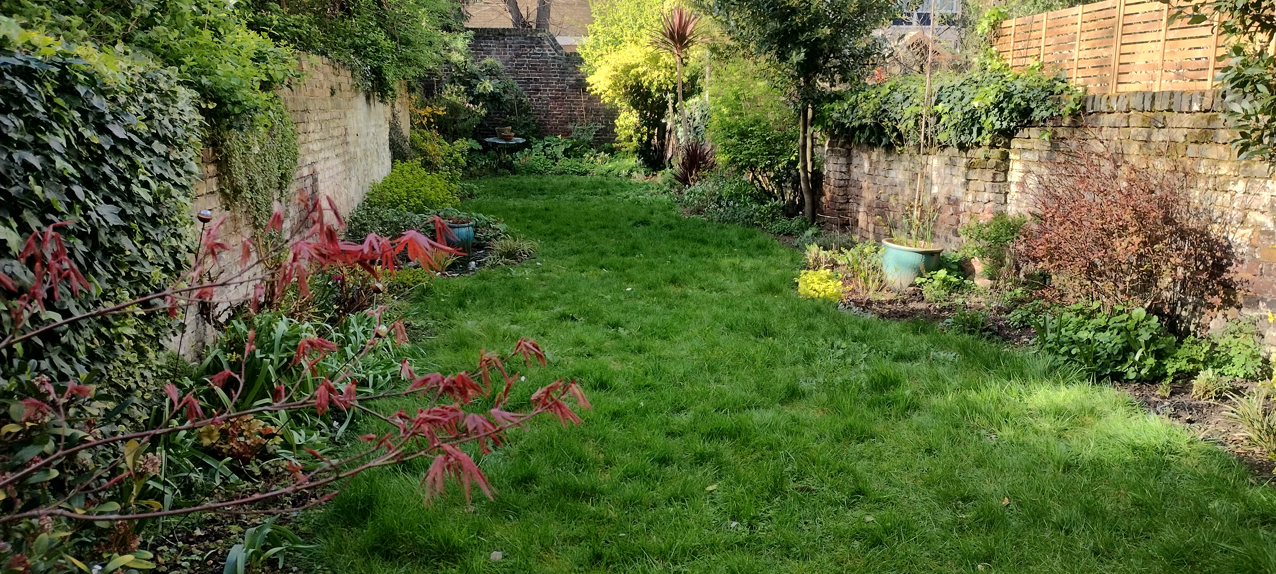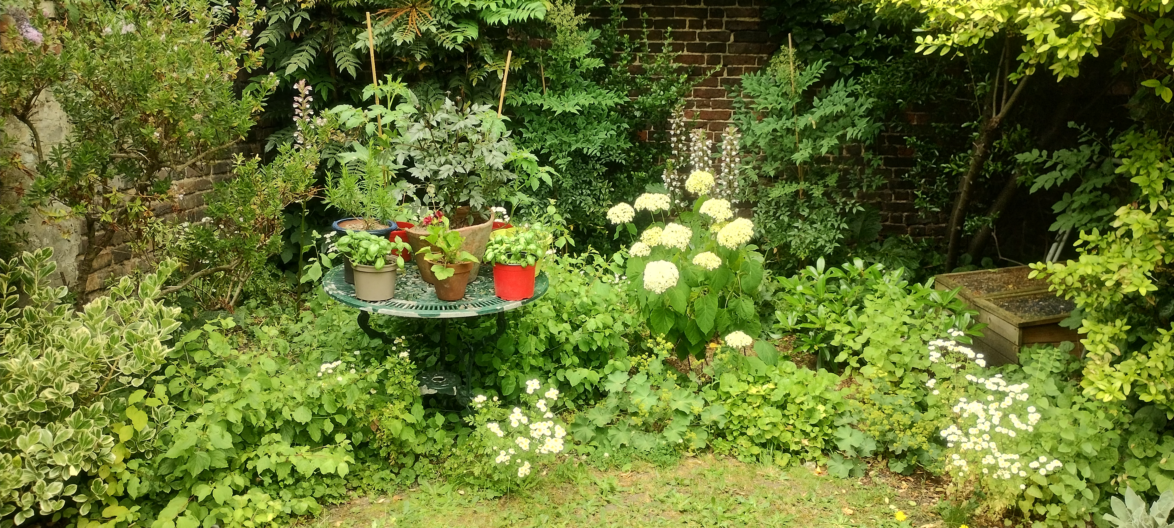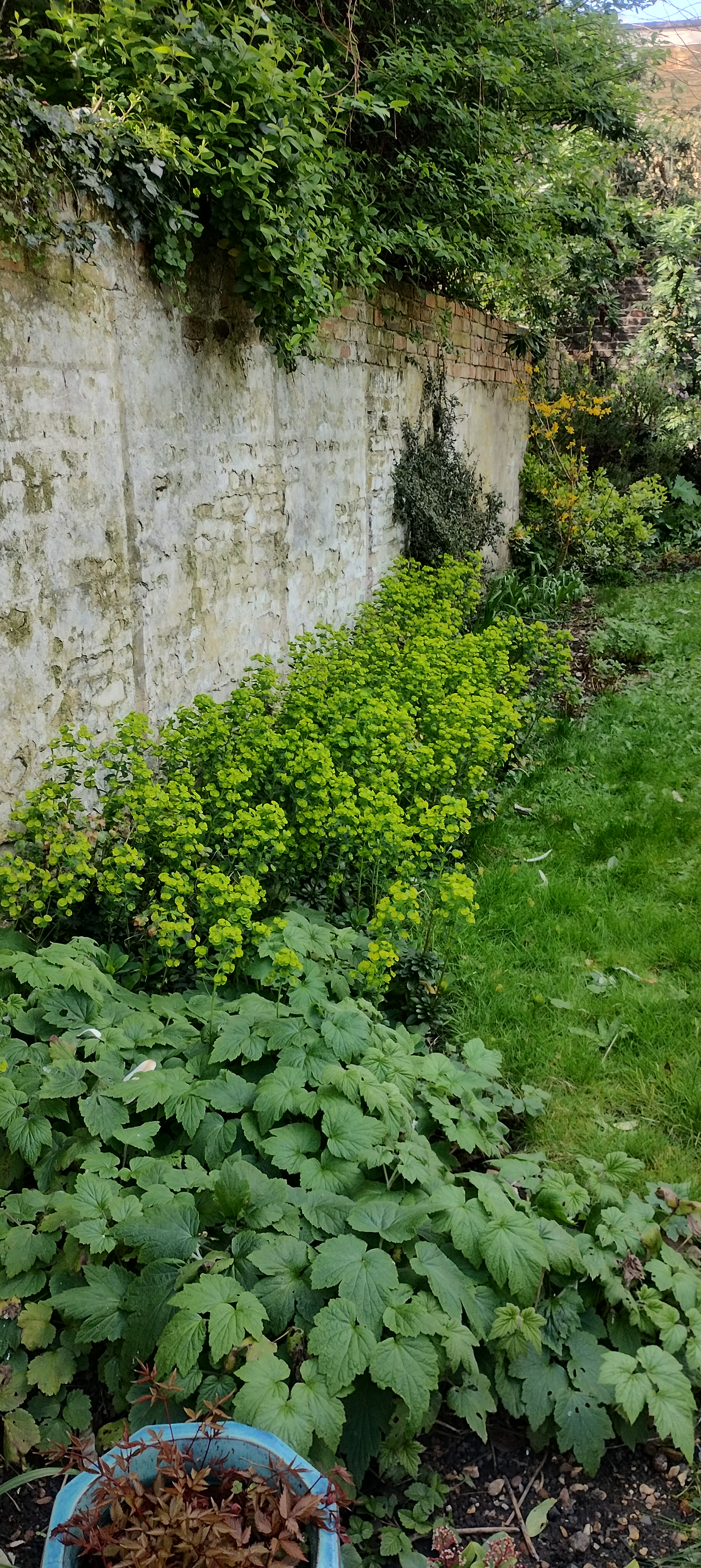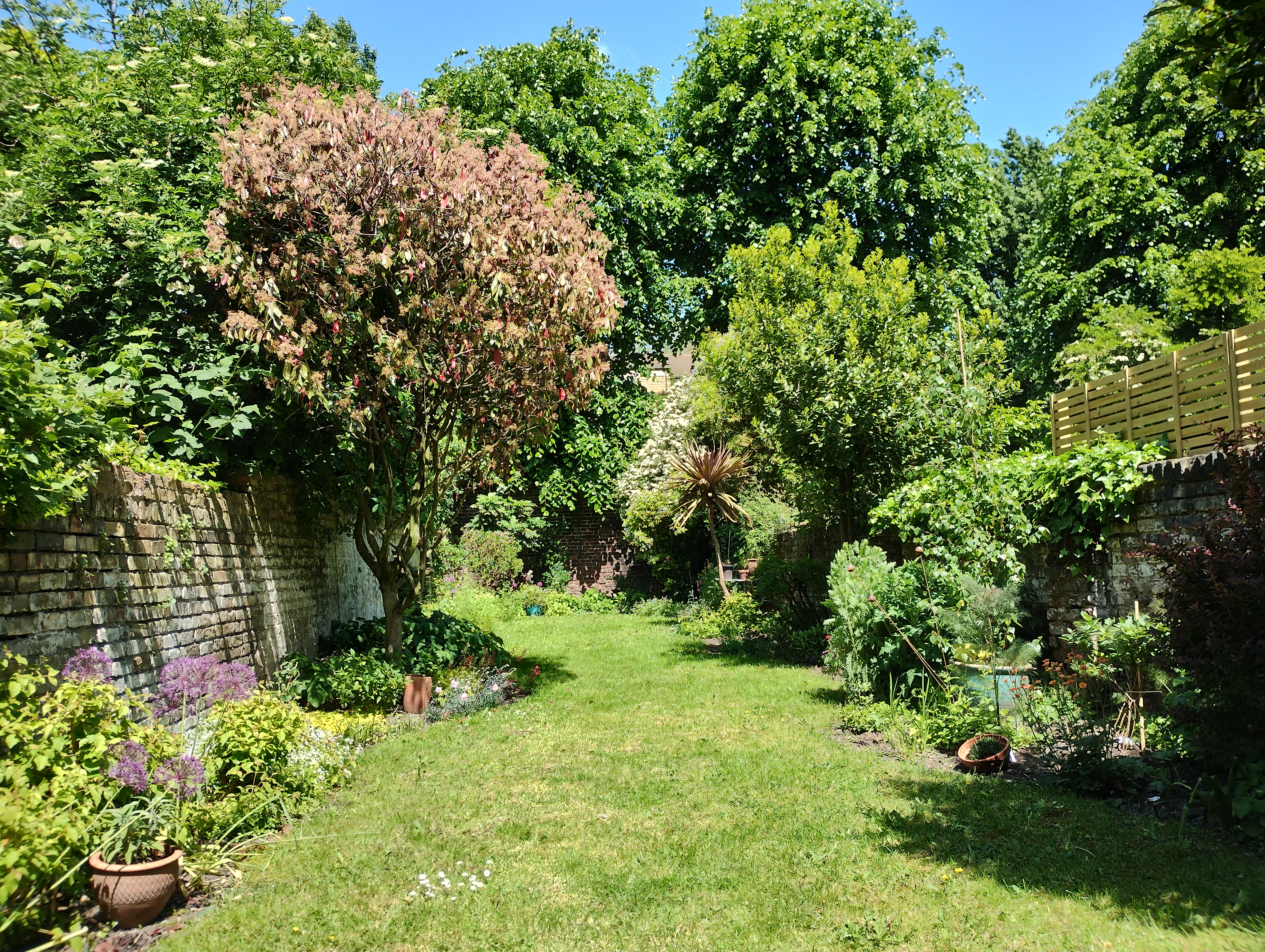 The teasel is now at my head height and producing spiky flower heads. The valerian planted at the end of June in the side beds seems to be slug-resistant and is establishing itself. The campion rescued from the lawn last year is flowering under the ceanothus and will hopefully spread this year. The Japanese anemones are putting up lots of buds. There have been flowers on the water lily, the sedge and the grasses have both grown, though I feel there’s more I could do with it (one bonus – it is a spectacular slug-trap)