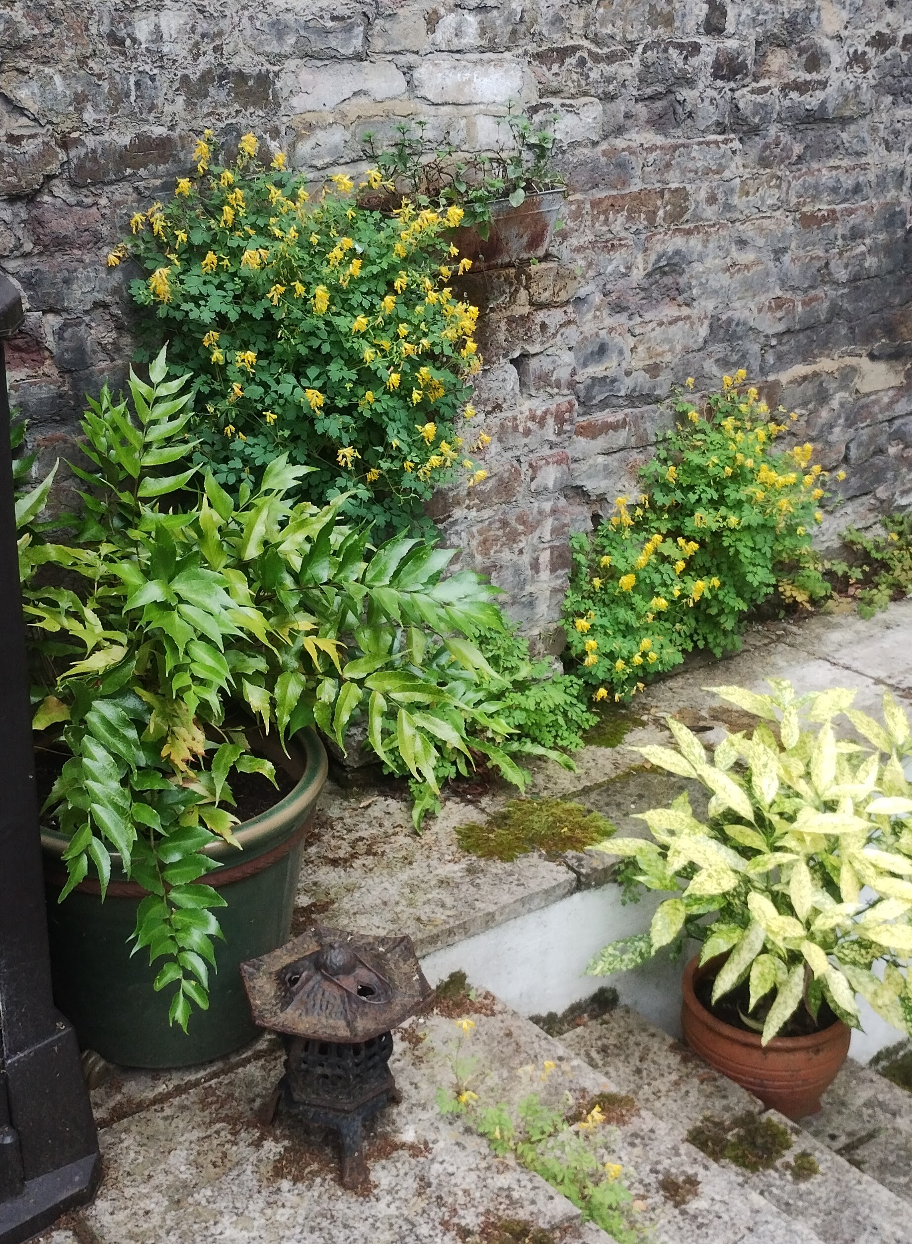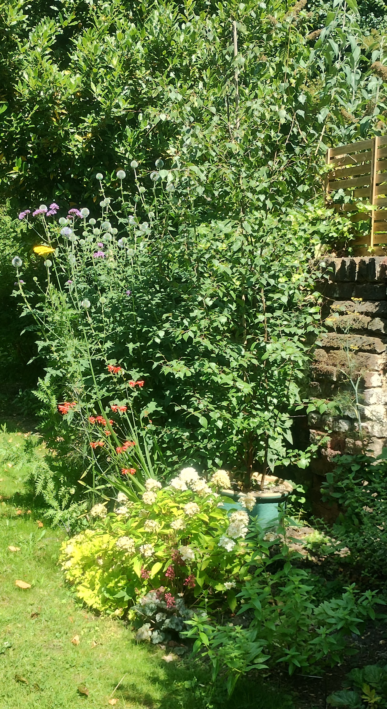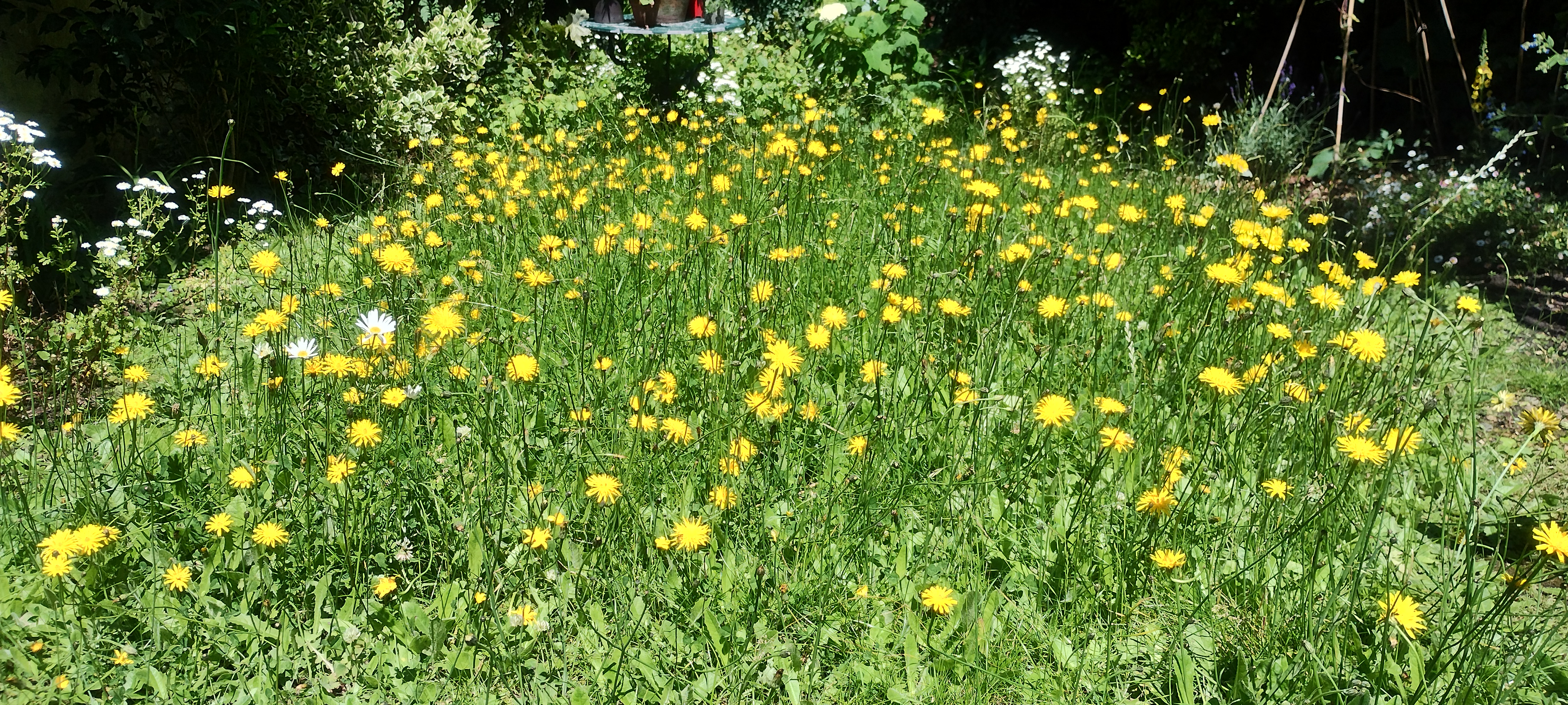 The dahlia is triumphantly recovered from the slugs and flowering – lots of buds, although the flowers only last a day or so. The crocosmia are a splash of orange in front of the echinops but mainly yellow and white are the predominant colours. The hydrangeas are fantastic, there are acanthus spikes still visible in the back bed and the nandina have sprays of tiny white flowers. The loosestrife and corydalis still doing their thing closer to the patio. The dandelions (which I learn are actually hawkbits) in the lawn are lovely.