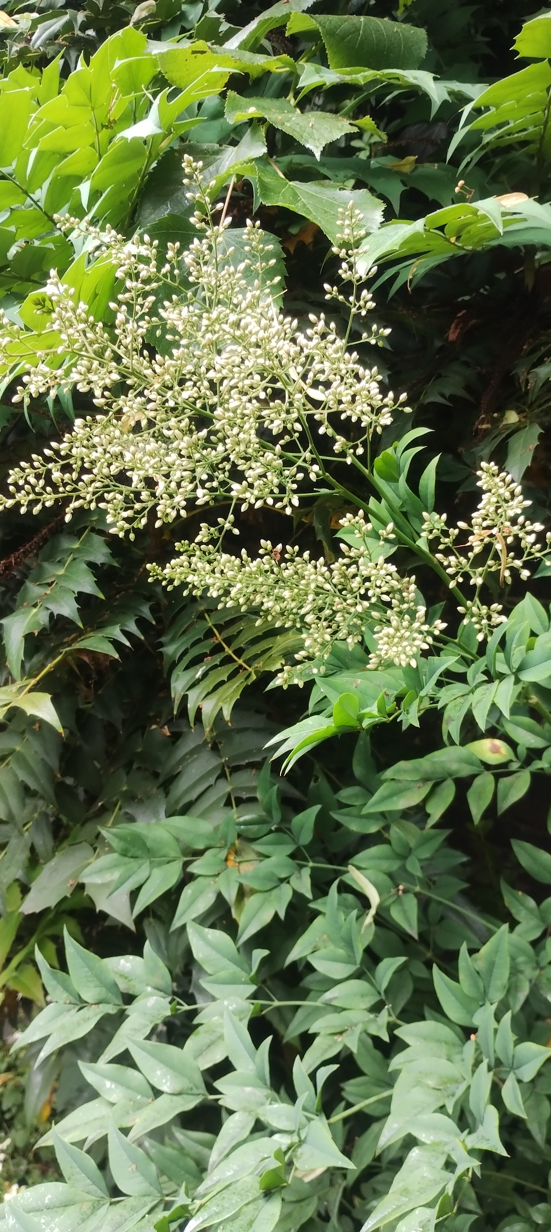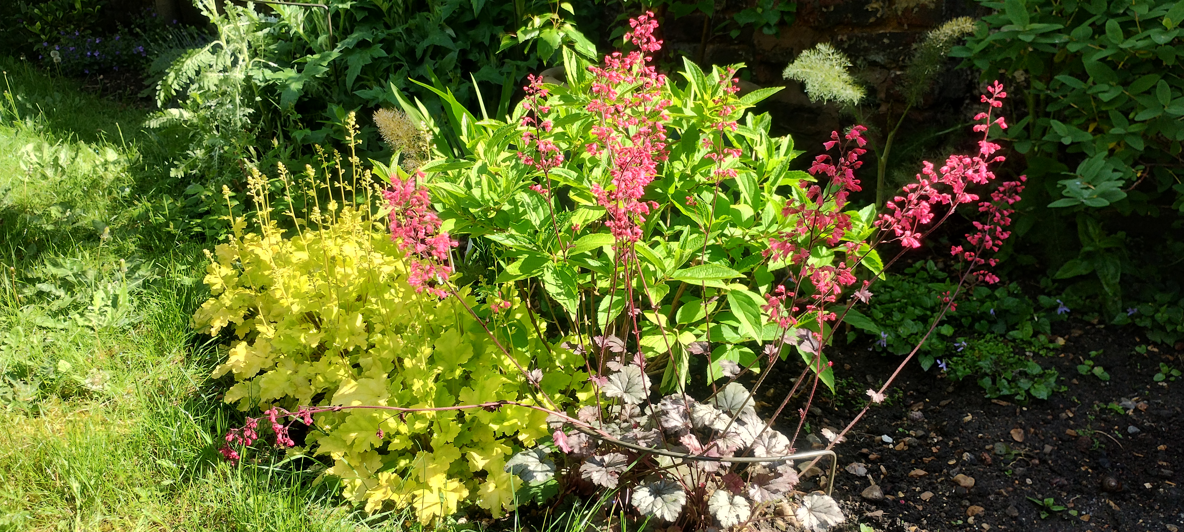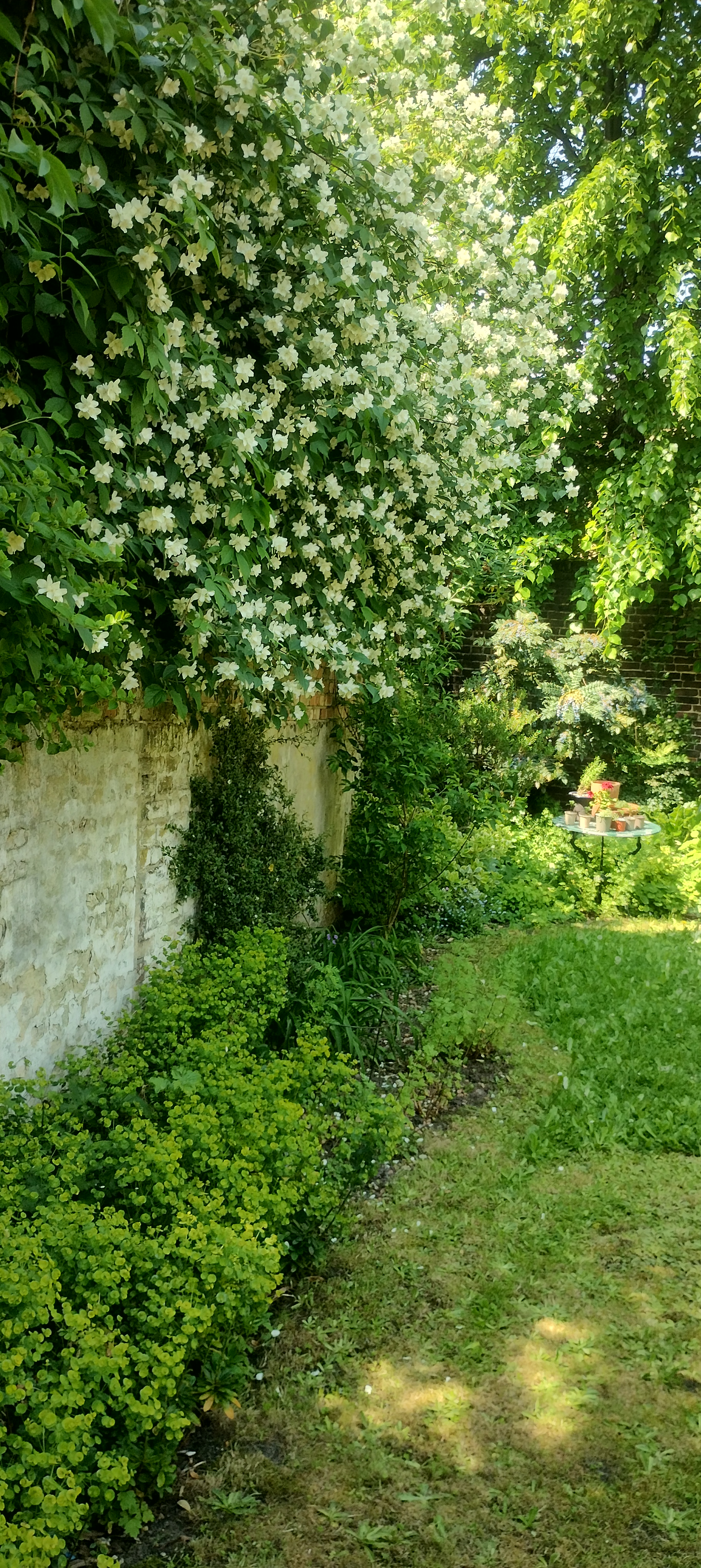 The dahlia is triumphantly recovered from the slugs and flowering – lots of buds, although the flowers only last a day or so. The crocosmia are a splash of orange in front of the echinops but mainly yellow and white are the predominant colours. The hydrangeas are fantastic, there are acanthus spikes still visible in the back bed and the nandina have sprays of tiny white flowers. The loosestrife and corydalis still doing their thing closer to the patio. The dandelions (which I learn are actually hawkbits) in the lawn are lovely.